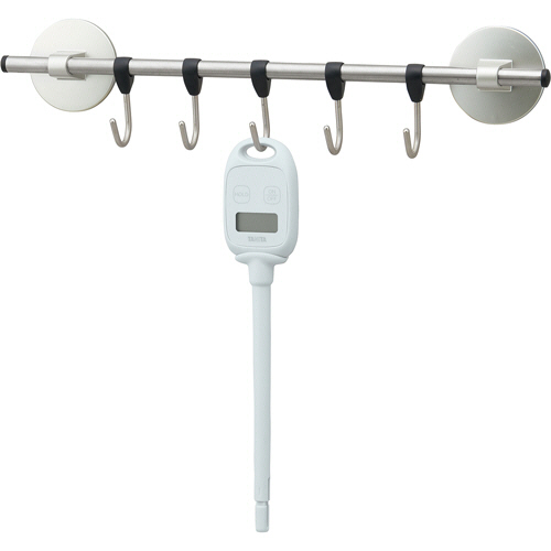 ●使いやすい設計。センサーホルダー(キャップ)をフック穴に差し込んで持てるので、熱い液体やお鍋の中の温度を計りたいときも、火元から手を離して使えます。